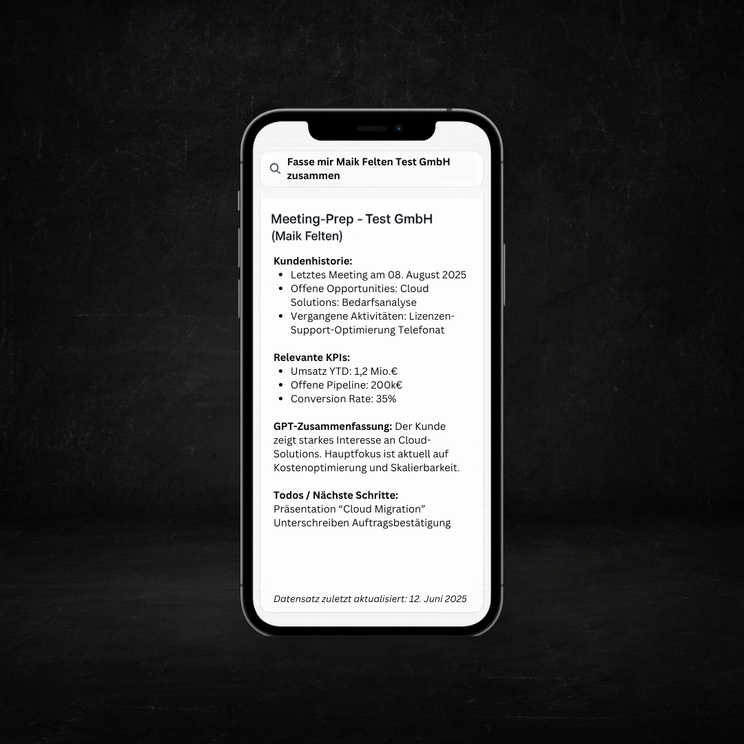 Ein KI-gestützter Workflow erstellt automatisch Meeting-Notes aus Salesforce-Daten, inklusive Kundenhistorie, relevanten KPIs und GPT-Zusammenfassung.